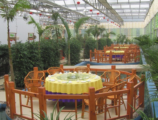 绿色生态餐厅中厅采用大型钢结构形式,跨度大,高度高、可植入高大树木,设置亭台,造景时有更大的发挥空间,使景色更加逼真。中厅周围设置其他配套连栋温室,大部分餐饮设置于其中,大大的降低造价和后期维护费用,同时保证了充足的活动空间,美景美食交相辉映,相得益彰。