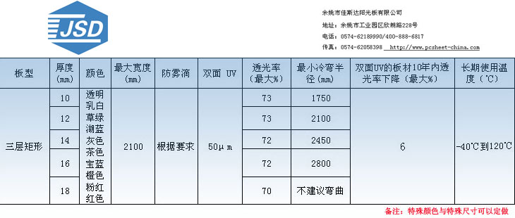 8. 表面有防紫外线的共挤层,可防止太阳光紫外线引起的树脂疲劳变黄。表面共挤层具有化学键吸收紫外线并转化为可见光,对植物光合作用有良好的稳定效果。人工气候老化试验4000小时,黄变度为2,透光率降低值仅0.6%。十年后透光流失仅为6%,PVC流失率则高达15%—20%,玻璃纤维为12%-20%。