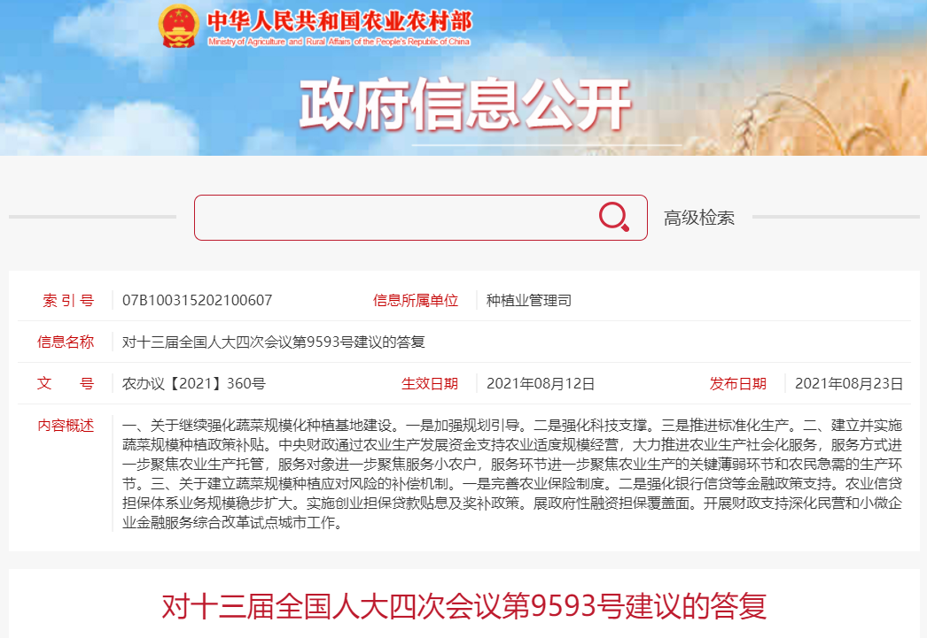 [公司新闻]农业农村部:加强规模化种植基地建设,支持蔬菜产业稳定发展